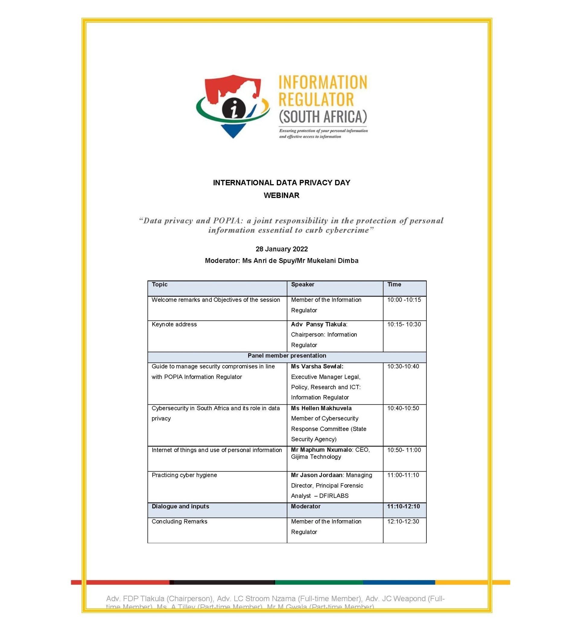 The Information Regulator South Africa will be hosting a webinar on the 28th January 2022 at 10:00 am (SAST) under the Theme “ Data privacy and POPIA: A joint responsibility in the protection of personal information is essential to curb cybercrime”.